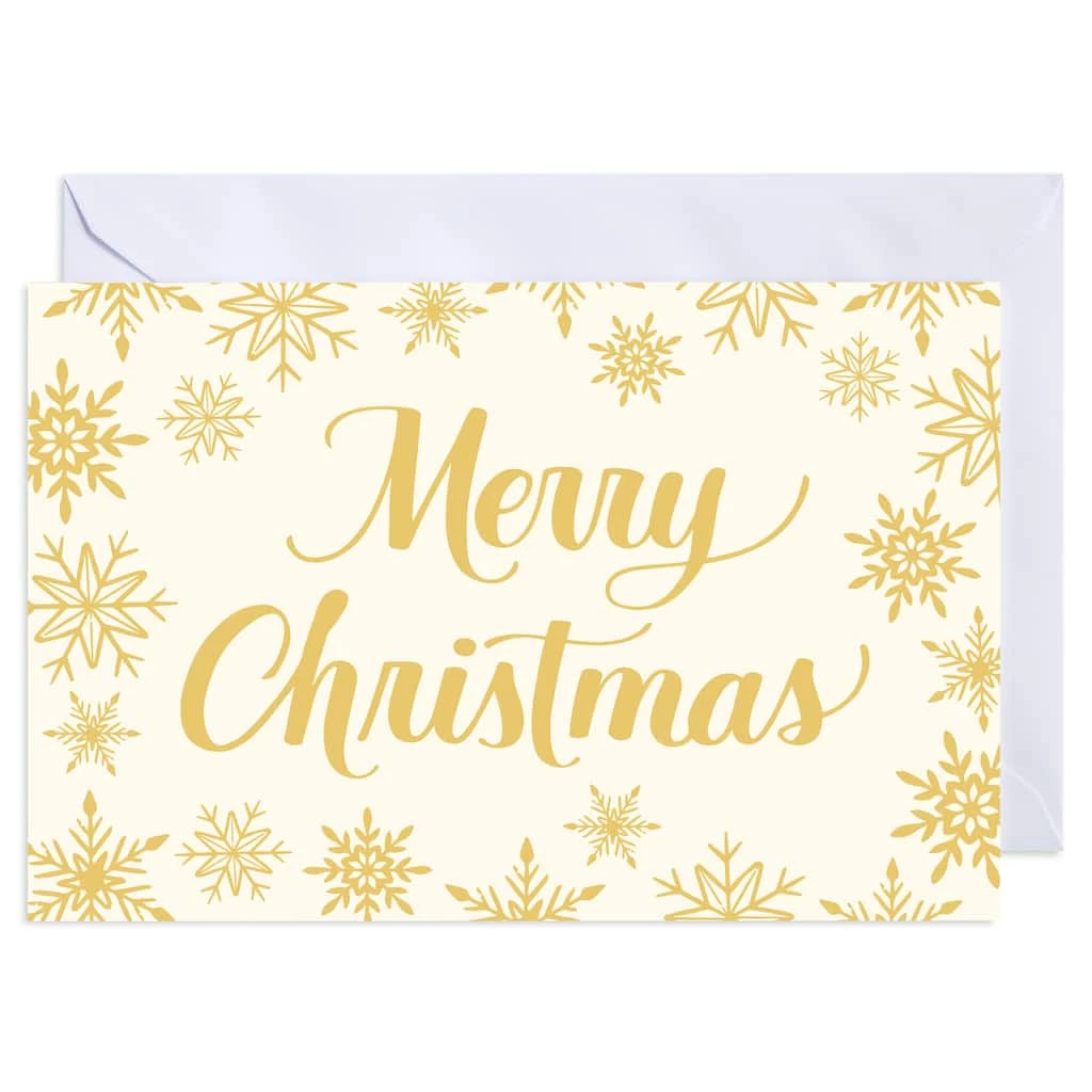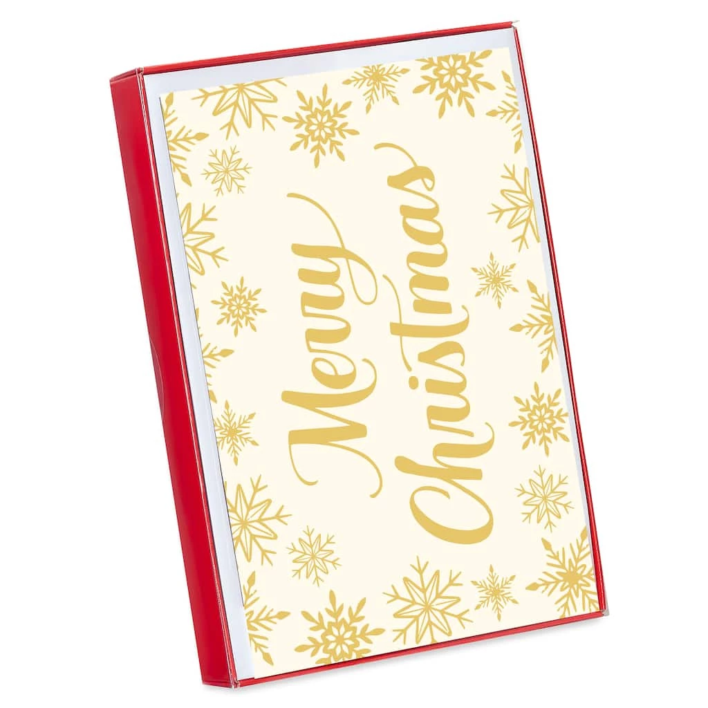Add a touch of classic charm to the Christmas season with this box of cards wishing recipients a “Merry Christmas” on a background of golden snowflakes. With a festive holiday wish inside, these cards are sure to warm the hearts of friends and family alike.