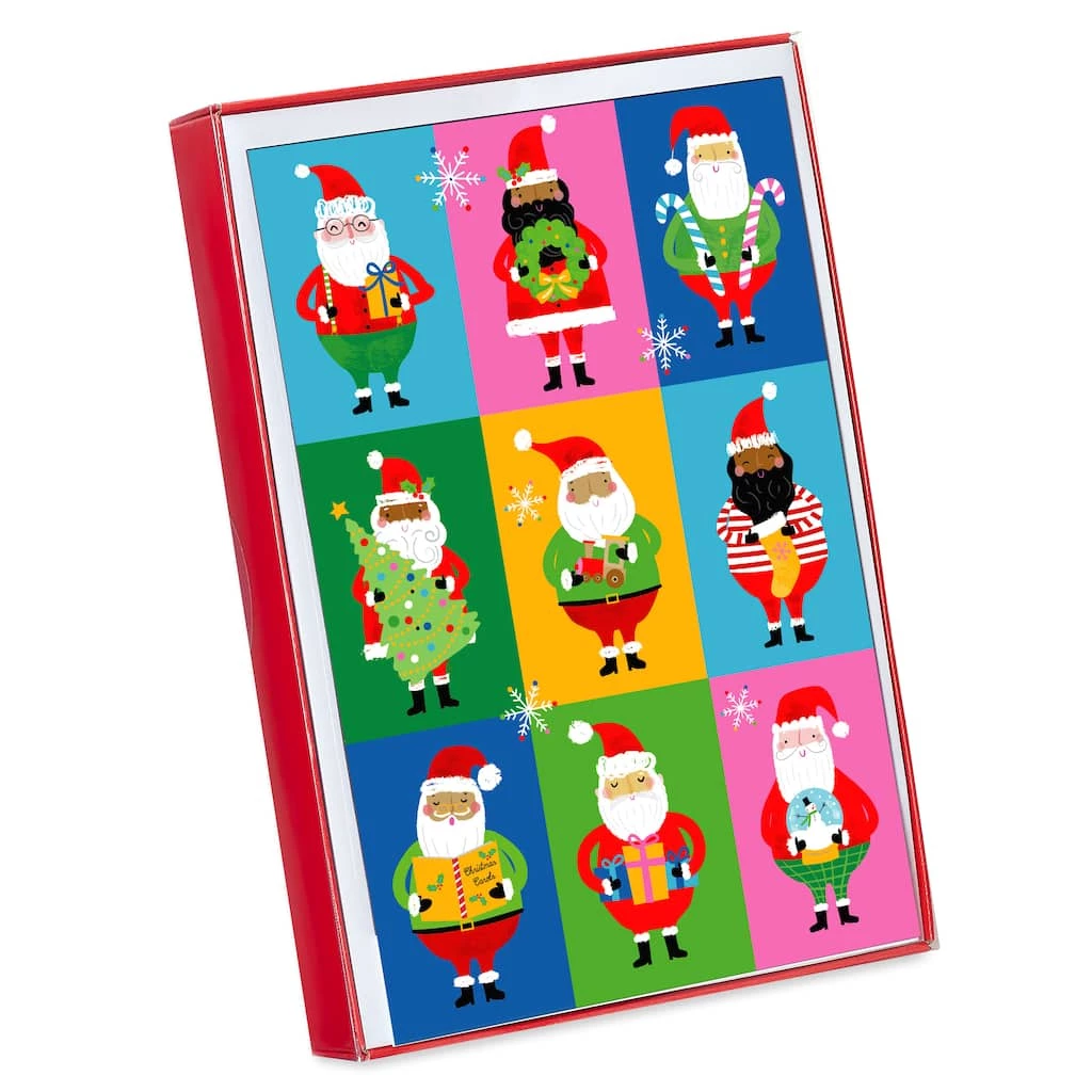 Add a touch of whimsy to the Christmas season with this box of cards featuring adorable Santas on brightly hued backgrounds. With a festive holiday wish inside, these cards are sure to warm the hearts of friends and family alike.