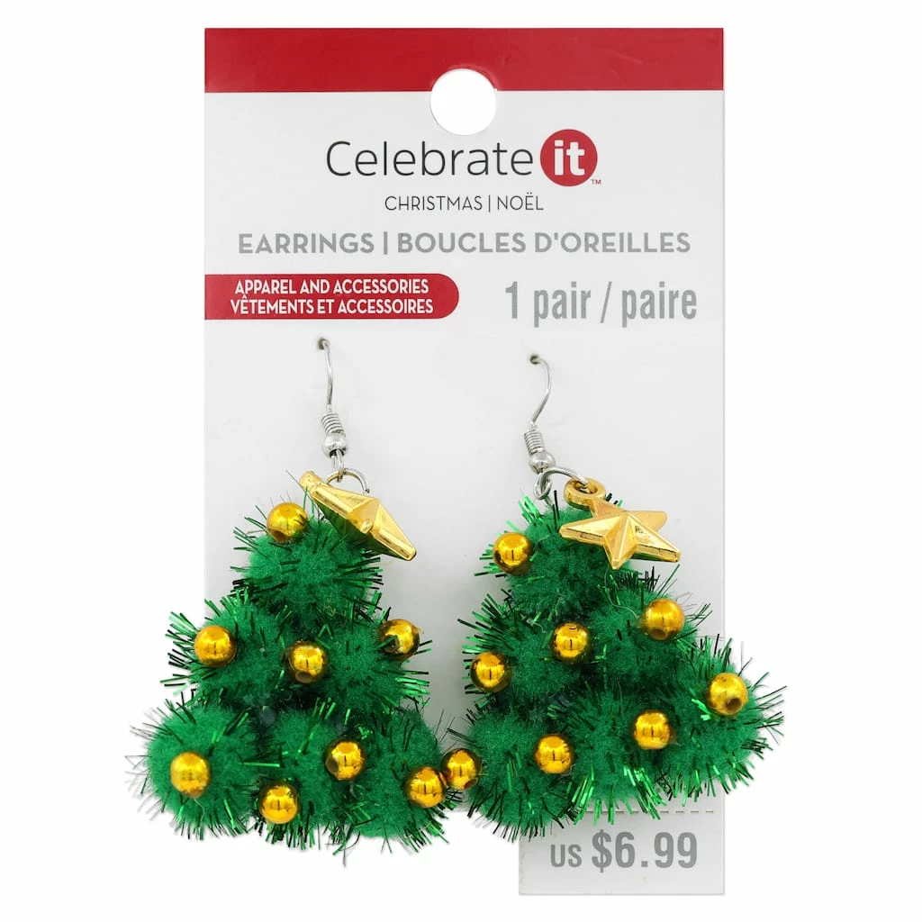 Bring a touch of festive flair to your holiday attire with these darling dangly earrings from Celebrate It. Featuring trees made of pom poms with gold stars and ball ornaments, these earrings are a great way to show your Christmas spirit at school, the office and gatherings with friends and family.
