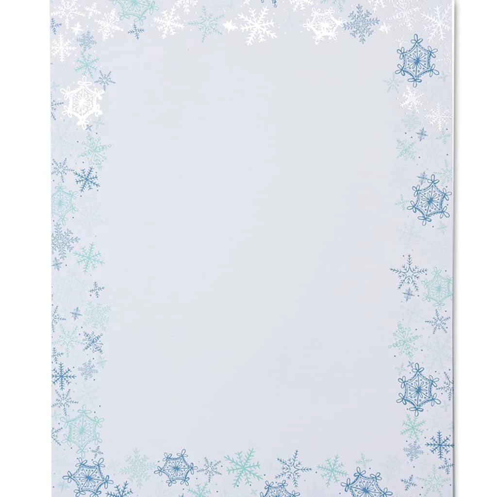 This wintry cool blue snowflake border holiday stationery paper features silver foil snowflake accents and is great for all your holiday correspondence needs.