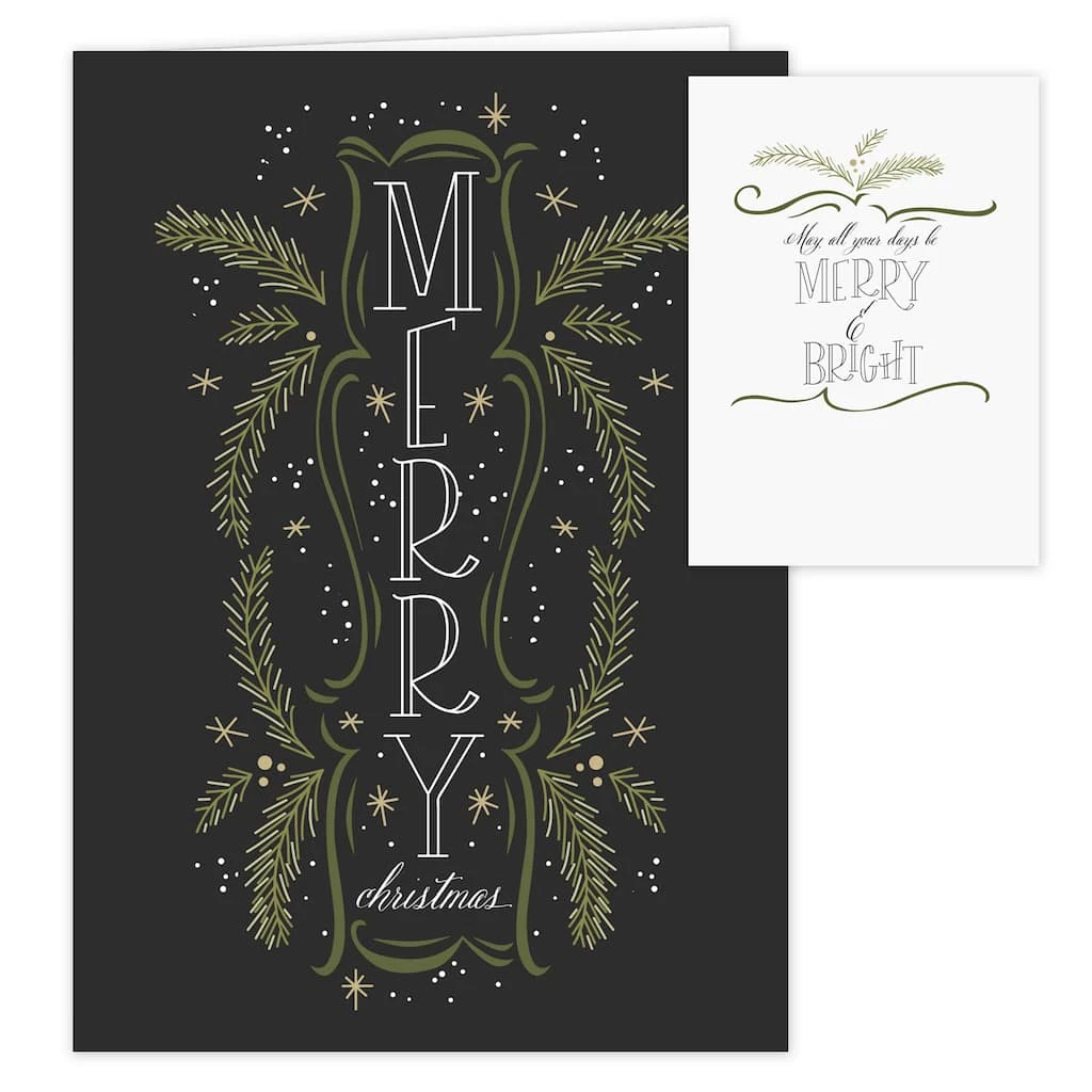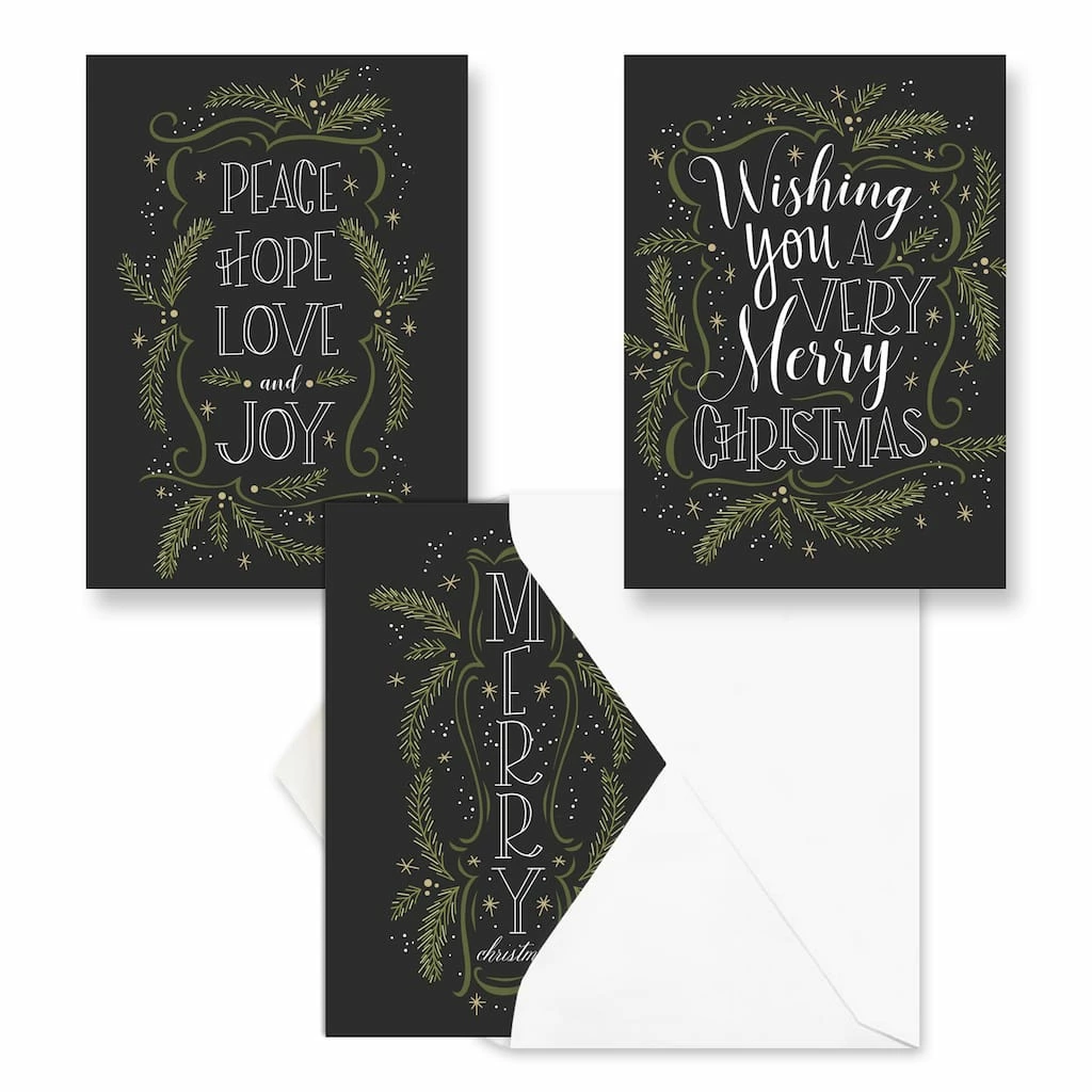 Spread some holiday cheer with these pine needles Christmas cards. This set comes with 3 different cheerful Christmas quote designs to send to your loved ones.