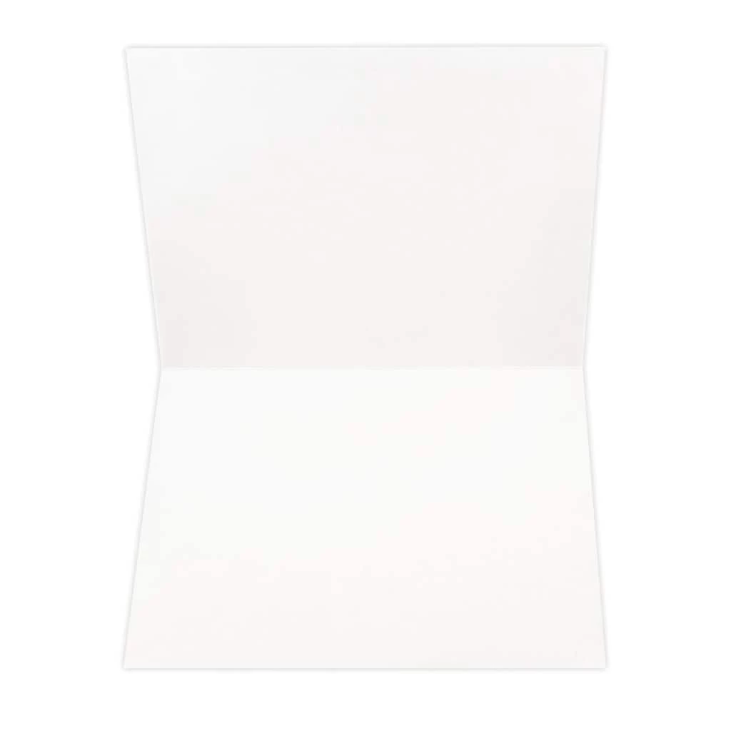 The fronts of these cards are a bright blue color and feature an image of red and white ribbons placed to look like the striped on the flag and looped into the shape of a Christmas tree. It is accented by several silver stars and sparkles and had a large a silver star on the you. “Happy Holidays” is written to the right in two different silver fonts.